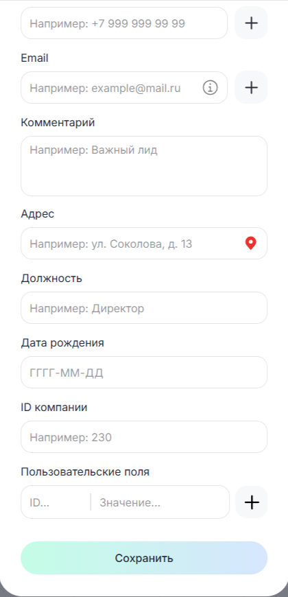 - Дата рождения — укажите дату рождения контакта в формате DD.MM.YYYY;