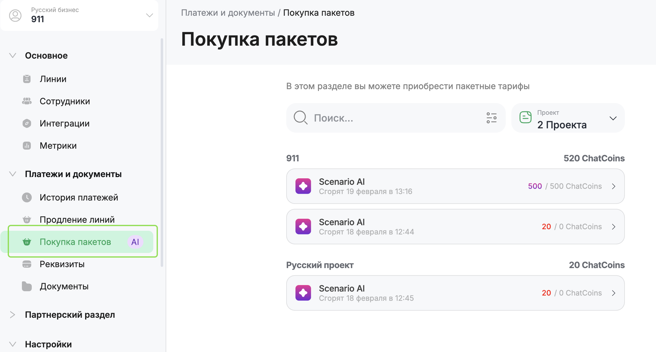 В разделе можно выбрать фильтр платежей по проектам, и просмотреть срок действия пакета и дату сгорания ChatCoins.