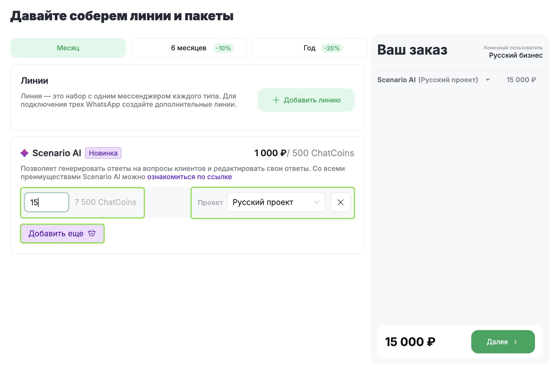 Шаг 3. В поле «Проект» выберите проект, для которого приобретаются ChatCoins. Если требуется купить ChatCoins для нескольких проектов, нажмите «Добавить ещё», выберите дополнительные проекты и укажите количество пакетов.