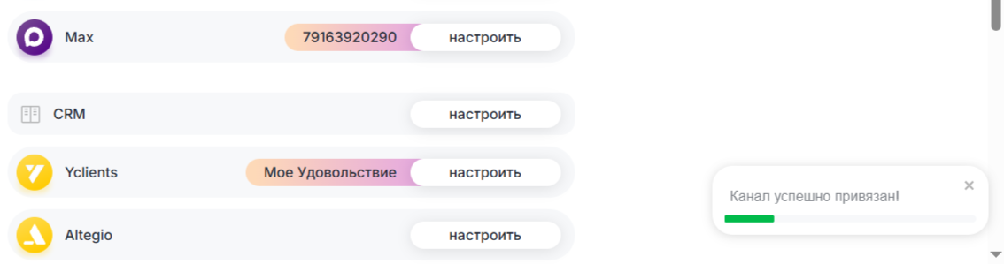 После успешного подключения, в приложении Max появится новое подключенное устройство, в настройках линии отобразится подключенный канал.