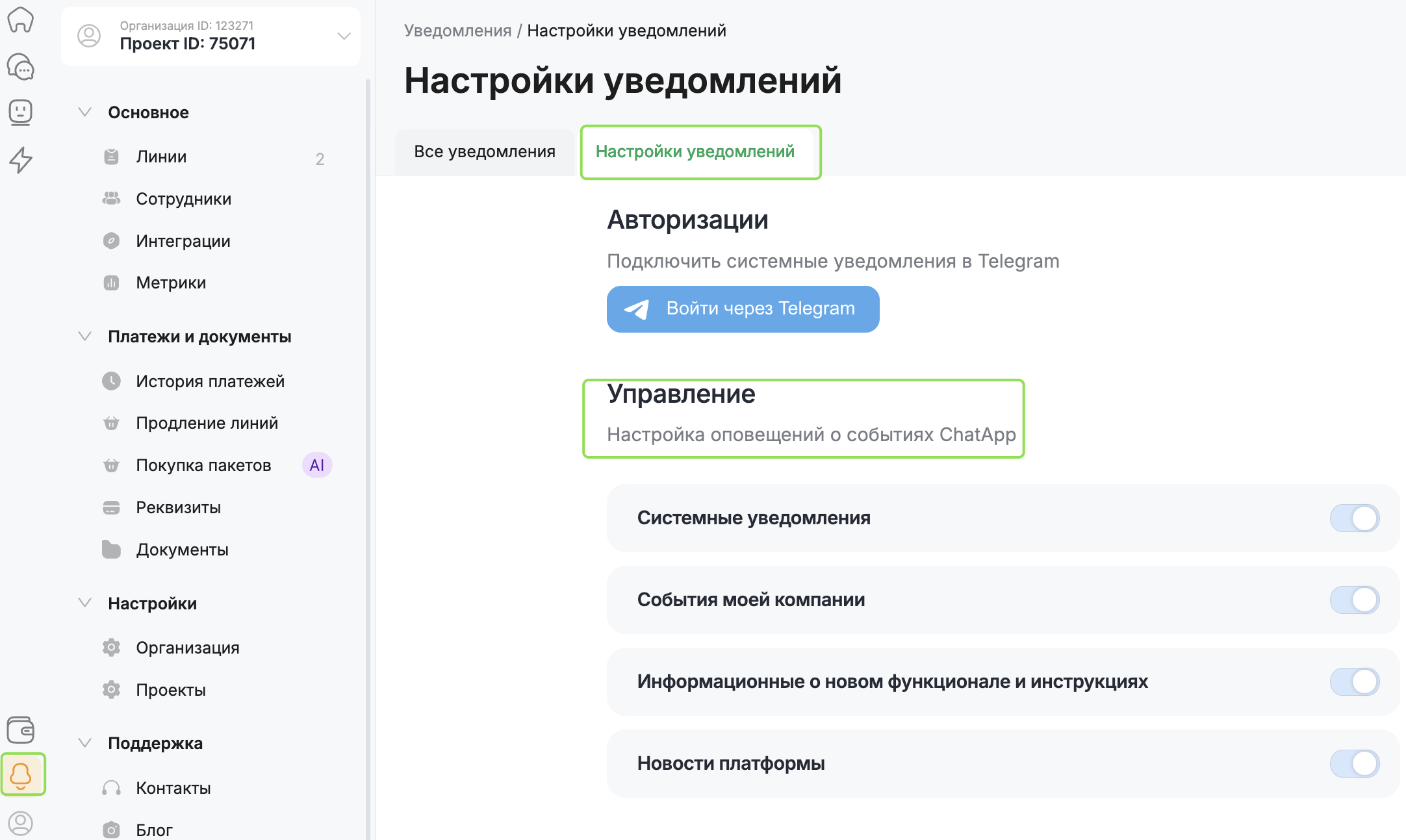 Подключите Telegram-уведомления для получения уведомлений о действиях по конкретным линиям. В мессенджер поступают уведомления о завершении срока действия линии, изменении статуса канала (авторизация/разавторизация), предупреждении за 5 дней о завершении линии и архивировании линии.