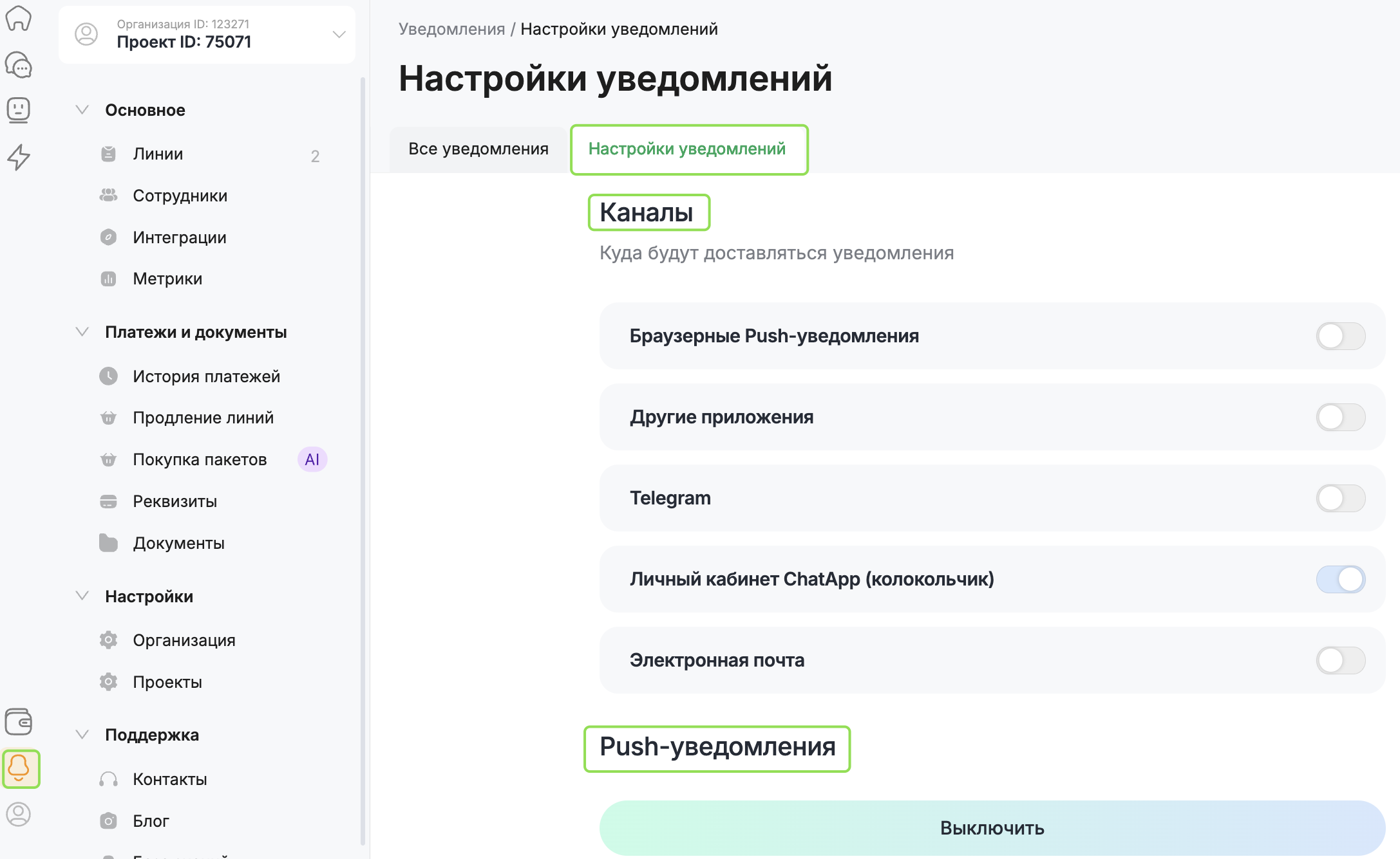 - Уведомления в Личном кабинете ChatApp (иконка колокольчика) — отключить нельзя.