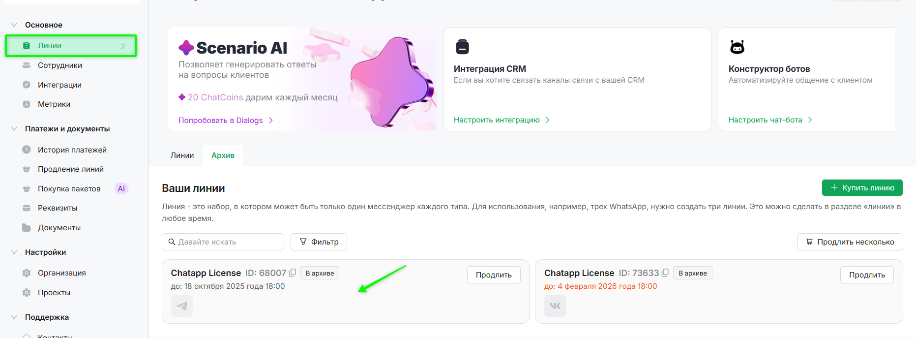 Линия — это сущность, объединяющая набор каналов мессенджеров и связанные с ними настройки.