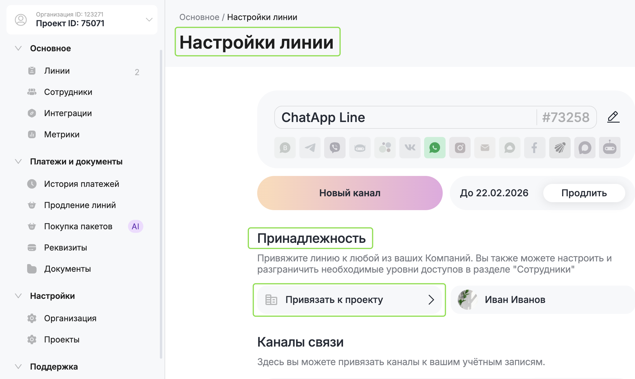 Если нужно изменить проект, к которому относится линия, или привязать линию к нескольким проектам в рамках одной организации, необходимо: