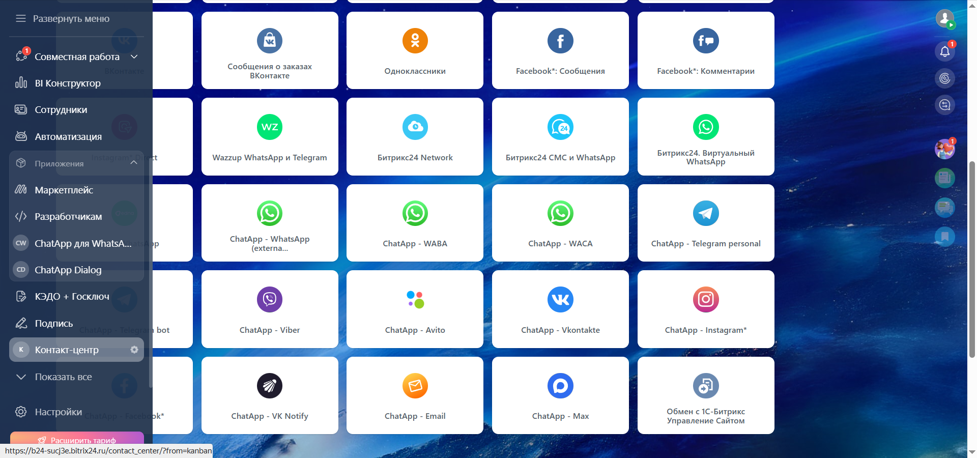 После установки приложения ChatApp в маркете Битрикс24, в разделе «Контакт-центр» создаются коннекторы ChatApp для настройки подключения каналов к открытым линиям.