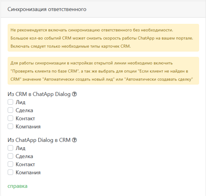 - Синхронизация ответственного — синхронизация ответственных между ChatApp и Битрикс24.