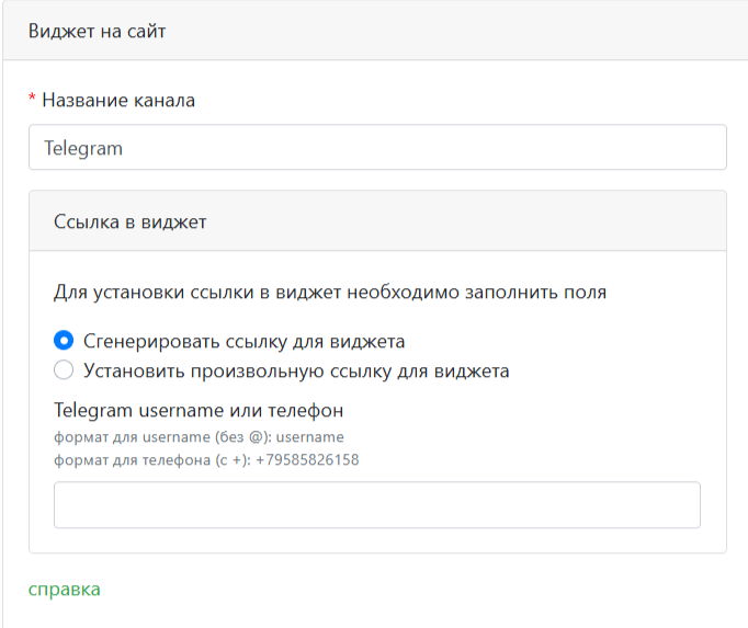- Виджет на сайт — удобное для вас название канала и ссылка на виджет на вашем сайте для быстрой коммуникации клиентов с вами.