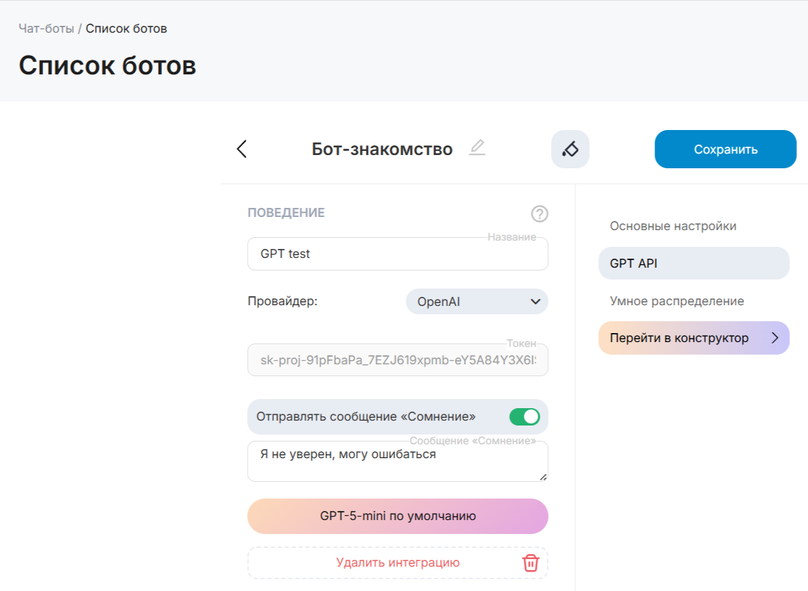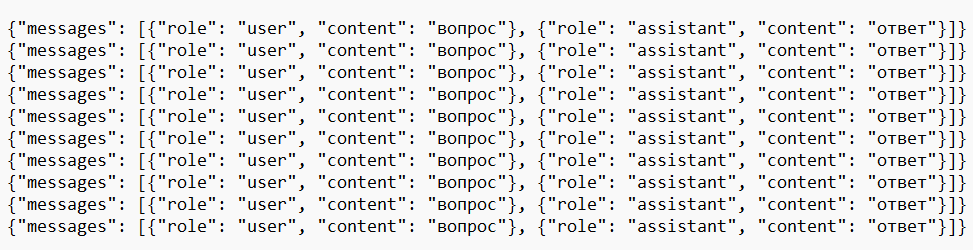 Обучение моделей После подключения ChatGPT к боту можно создавать новые модели для обучения. Это нужно, чтобы AI узнал о вашей компании и мог ответить на вопросы про нее. Обучение модели происходит на основе быстрых ответов. Как их подготовить -- читайте в статье «Типовые быстрые ответы». Также можно использовать файлы JSONL. Создание файла JSONL для обучения модели JSONL — формат, в котором каждая строка файла — JSON. 1. Создайте файл формата JSONL, например, в обычном текстовом редакторе. 2. В файле создайте не менее 10 строк - примеров с вопросами пользователя и ответами ассистента. Формат строки: {"messages": [{"role": "user", "content": "вопрос"}, {"role": "assistant", "content": "ответ"}]} Роль (role) может быть двух видов: ассиcтент (assistant) или пользователь (user). Контент (content) — текст сообщения. Вопрос или ответ не должны превышать 5000 символов или быть пустыми. Создание модели для обучения 1. Перейдите в бот, к которому подключен ChatGPT; 2. Выберите в Основных настройках «GPT API» и заполните основные параметры.   3. Включите опцию Отправлять сообщение «Сомнение», если в этом есть необходимость — бот будет отправлять введенное сообщение, когда не может найти точный ответ на запрос клиента. 4. Нажмите на поле с моделью OpenAI и выберите модель из доступных.   5. Выберите уже существующую модель либо нажмите на «+», чтобы создать новую. 6. В окне «Новая модель» заполните параметры: