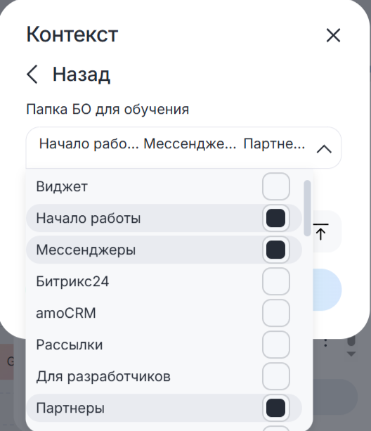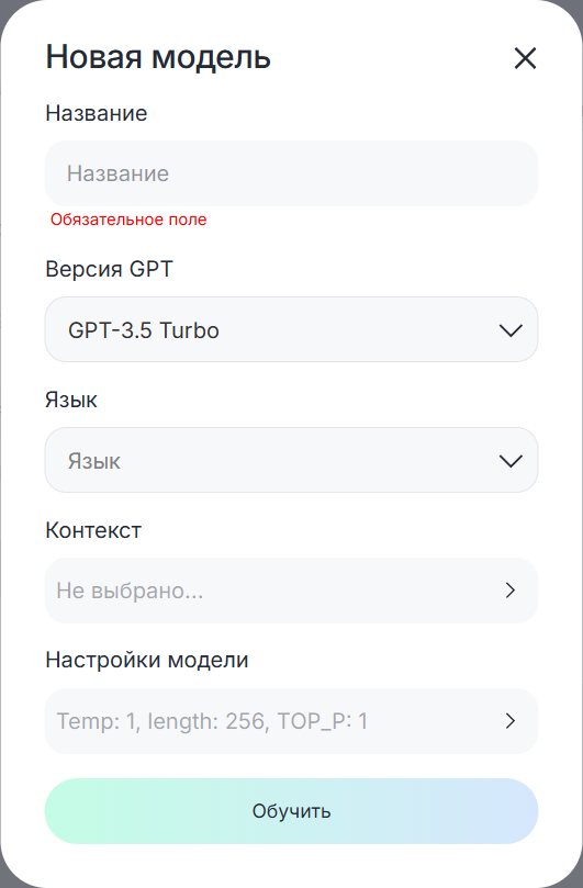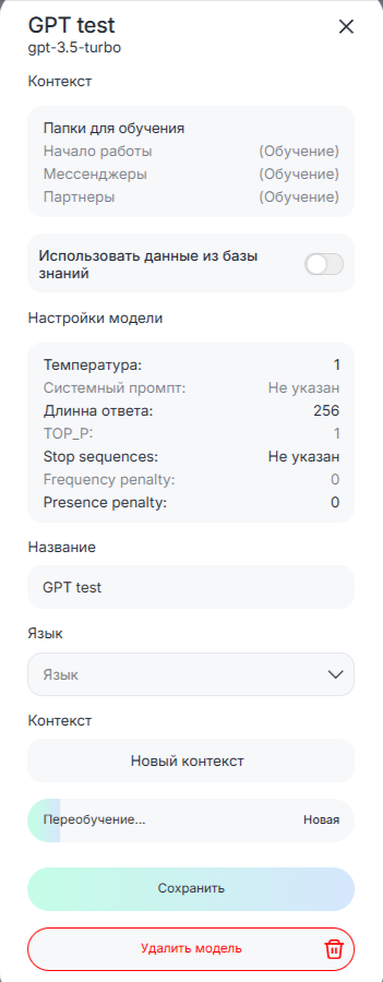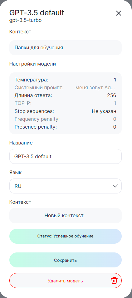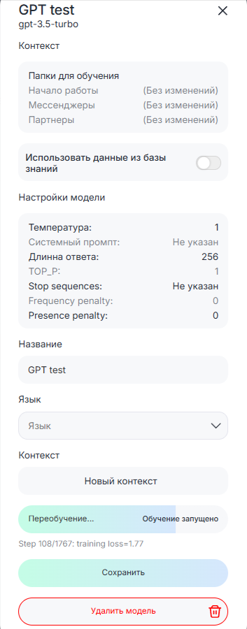 7. После заполнения параметров нажмите «Готово» и в меню модели — «Обучить». Результат успешного обучения будет отображен в статусе модели:   Процесс обучения отображается над полем "Сохранить".   После завершения процесса обучения можно будет использовать в Конструкторе ботов. 8. Нажмите «Сохранить» модель и сам чат-бот. Как проверить статус обучения 1. Нажмите «Выбрать модель»; 2. Нажмите на нужную модель; 3. Появится оно с процессом обучения. Можно изменить имя, язык и добавить контекст, чтобы запустить «Переобучение» — дополнить обучение модели.
