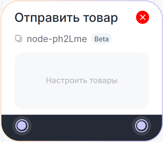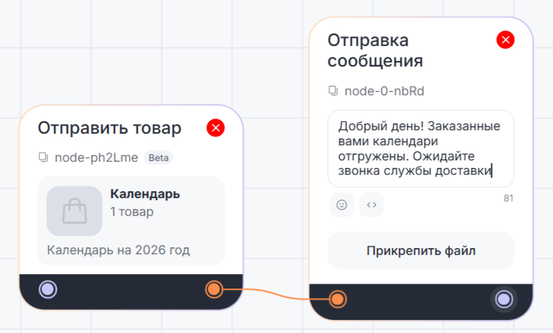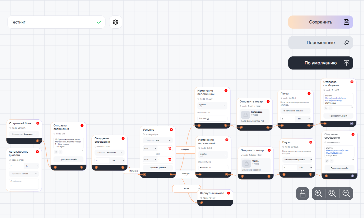 После заполнения нажмите «Добавить товар» и «Сохранить». 3. Соедините блок с другими.   4. Сохраните сценарий. Пример сценария в Конструкторе ботов 1. При запуске чат-бот попросит клиента выбрать товар. 2. При выборе варианта «1» отправится товар «Календарь», при выборе «2» Обувь. 3. Когда бот дойдет до блока «Отправить товар», клиенту отправится в чат карточка товара. 4. Клиент открывает карточку и выбирает товар. 5. В Scenario Dialogs отобразится ответ на карточку товара.   *Facebook принадлежит Meta, признанной в Российской Федерации экстремистской организацией