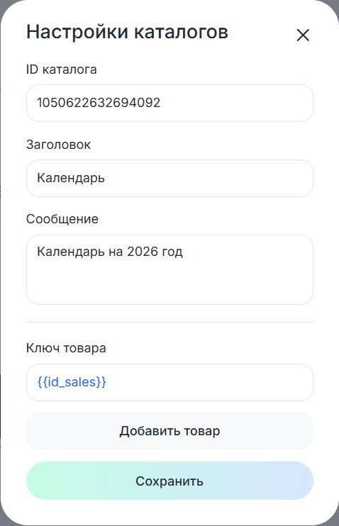 Настройка каталога Facebook Если в сервисе Facebook Commerce Manager настроен каталог с товарами, в диалог с клиентом можно отправить карточку или список товаров. Карточки товаров повышают интерес клиентов к покупке. Инструкцию по созданию каталога товаров читайте на портале Facebook* — Способы добавления позиций в каталог. Настройка блока «Отправить товар» 1. Перейдите в Редактор сценариев и добавьте блок «Отправить товар» в рабочую область.   2. Нажмите в поле «Настроить товары» и заполните данные: