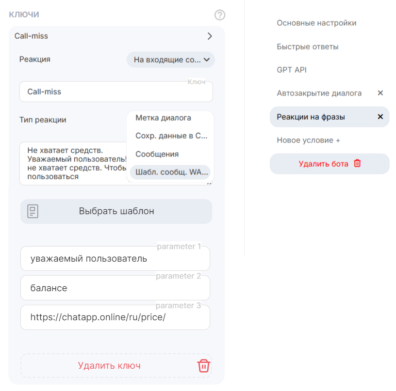 Ответ шаблоном WhatsApp Business API в Готовых сценариях Конструктора ботов