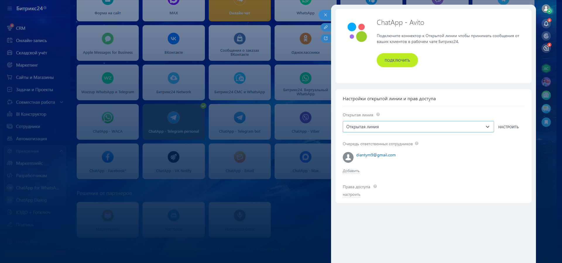 1. Зайдите в Контакт-центр Битрикс24 и выберите коннектор «ChatApp – Avito».