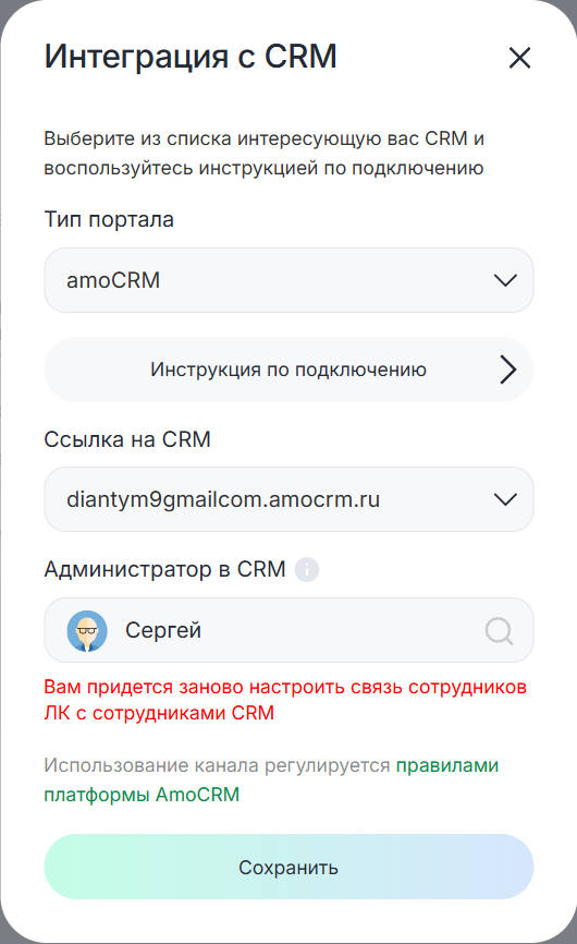6. В поле «Ссылка на CRM» выберите ваш аккаунт в amoCRM.