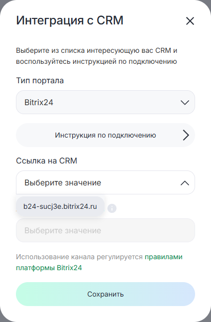 6. В поле «Ссылка на CRM» выберите ваш аккаунт в Bitrix24.
