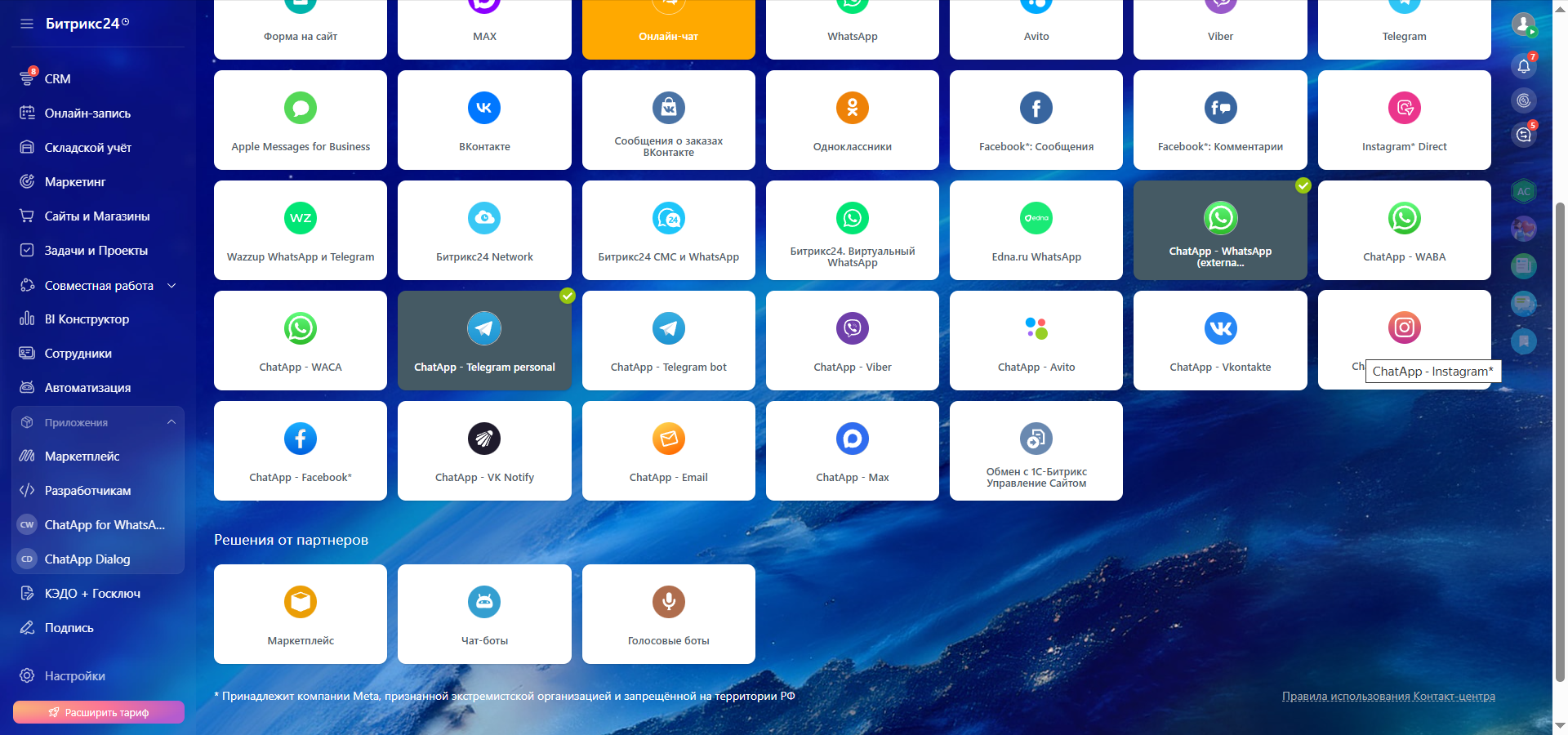 1. Зайдите в Контакт-центр Битрикс24 и выберите коннектор «ChatApp – Instagram*».