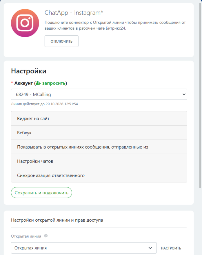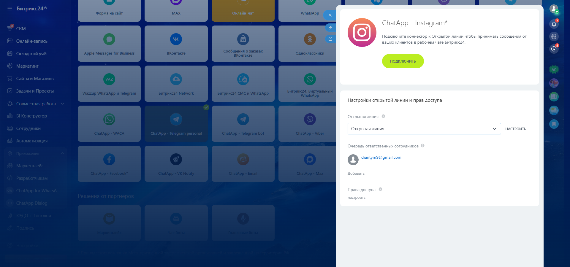 Убедитесь, что в Личном кабинете ChatApp подключен канал Instagram*, а в Битрикс24 установлен виджет ChatApp.