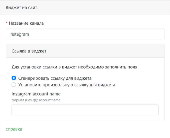 - Виджет на сайт — удобное для вас название канала и ссылка на виджет на вашем сайте для быстрой коммуникации клиентов с вами.
