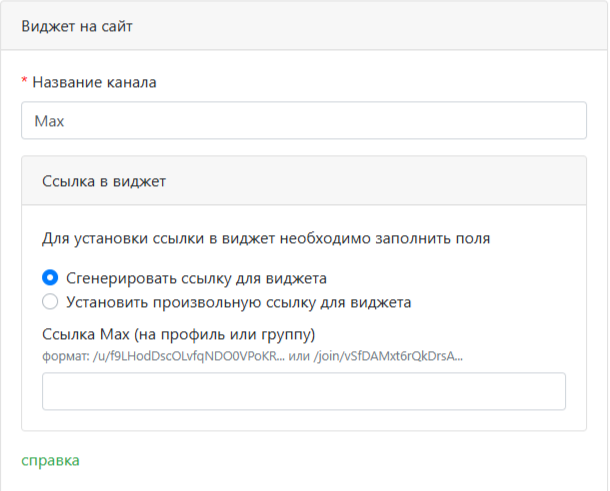- Виджет на сайт — удобное для вас название канала и ссылка на виджет на вашем сайте для быстрой коммуникации клиентов с вами.