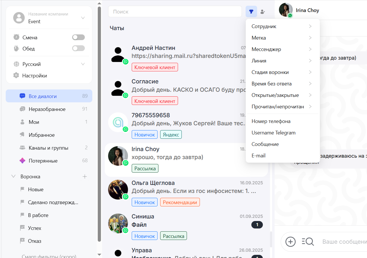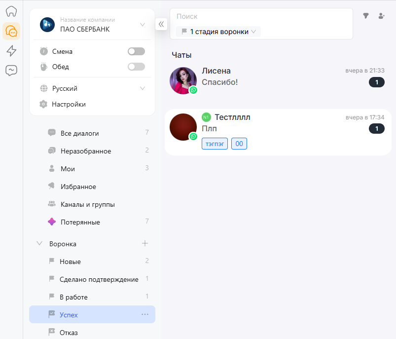 3. Вы можете фильтровать диалоги по стадии воронки. Выбрав стадию, вы увидите все диалоги, которым эта стадия установлена.
