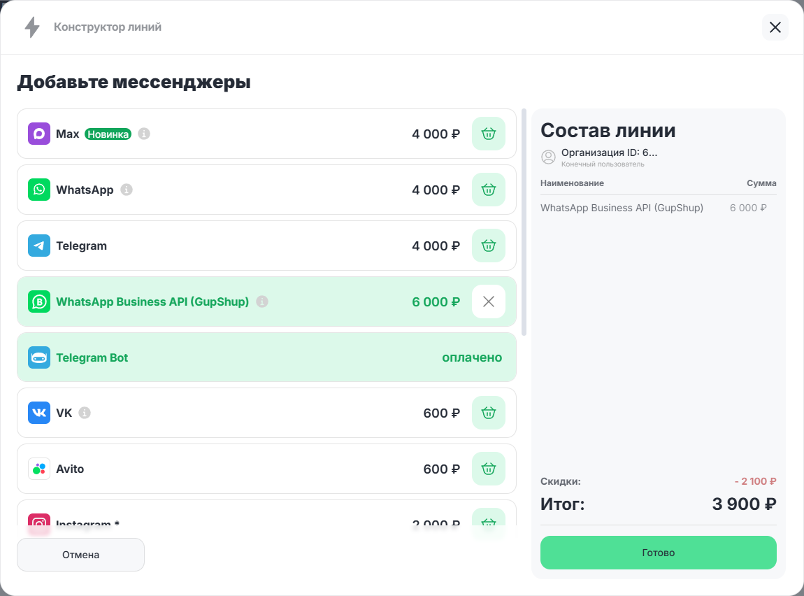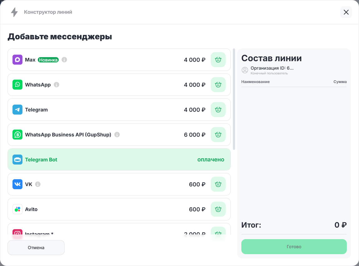 Если для работы не хватает какого-то канала, вы можете не создавать новую линию, а докупить недостающие каналы в существующую линию клиента. Вы можете купить новый канал в линию за 6 и более дней до окончания ее действия.