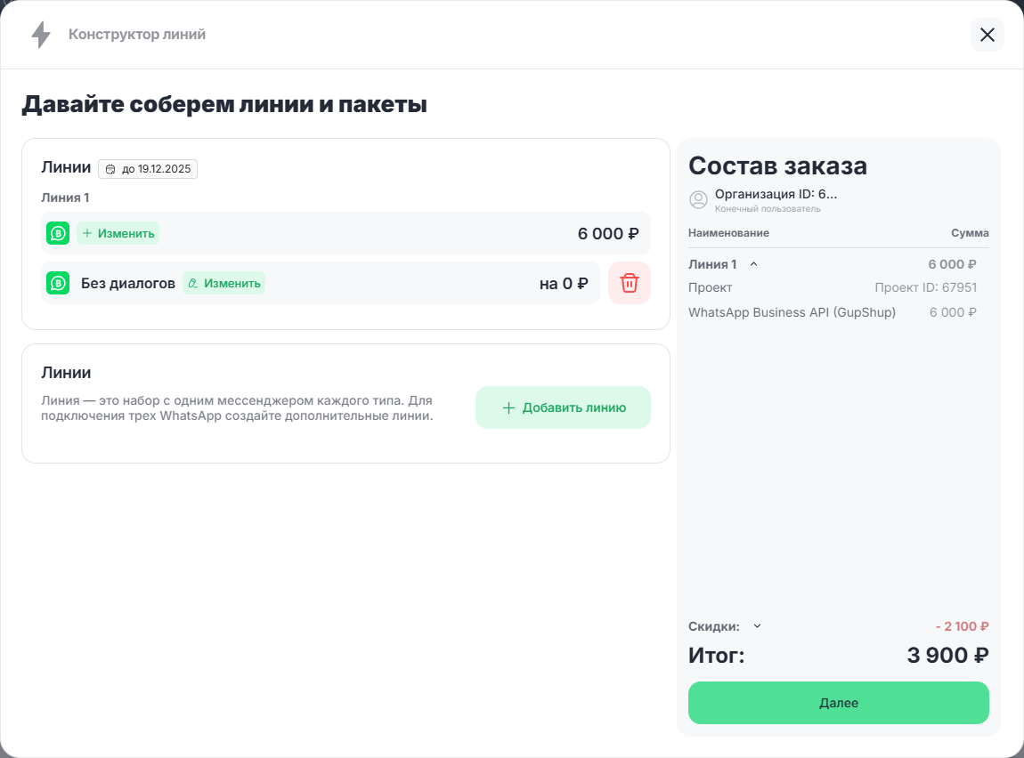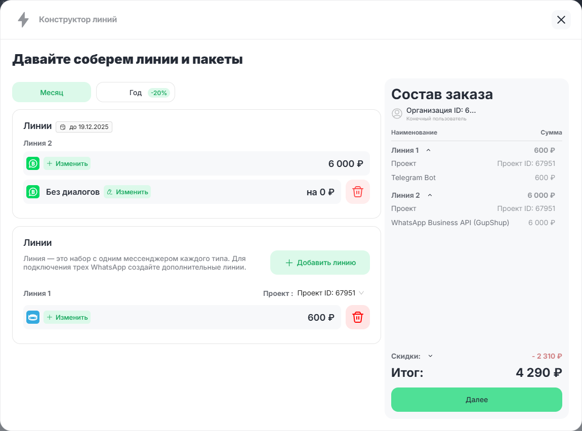 5. Нажмите на кнопку «Далее» для перехода к оплате. Как оплатить покупку каналов в лини — читайте в статье “Оплата линии клиента“.