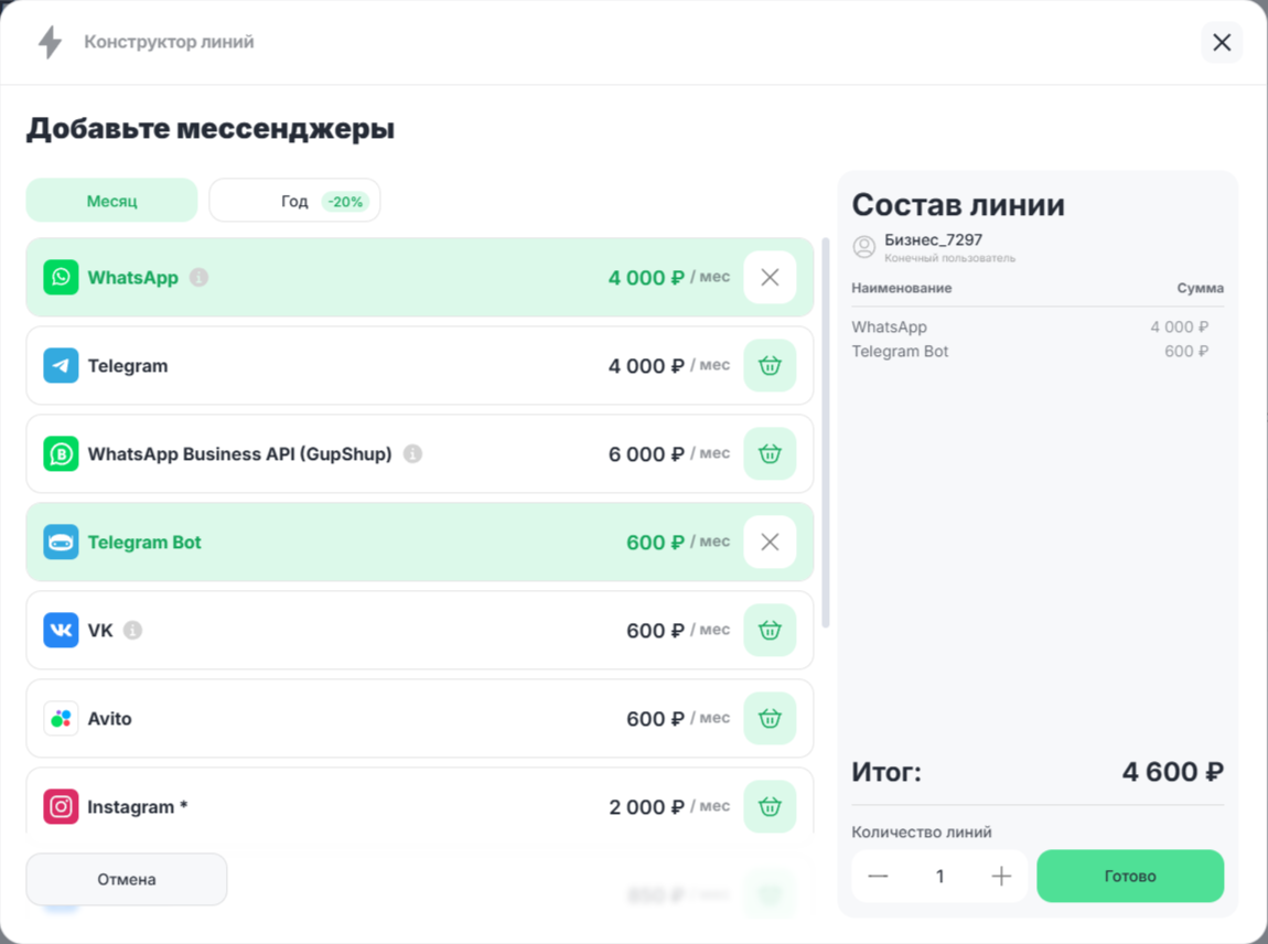 3. Выберите, на какой срок хотите приобрести линию и каналы, отметив поле «Месяц» или «Год». При покупке лицензии на 12 месяцев действует скидка 20%. Стоимость лицензии на канал устанавливается в соответствии с выбранным сроком.