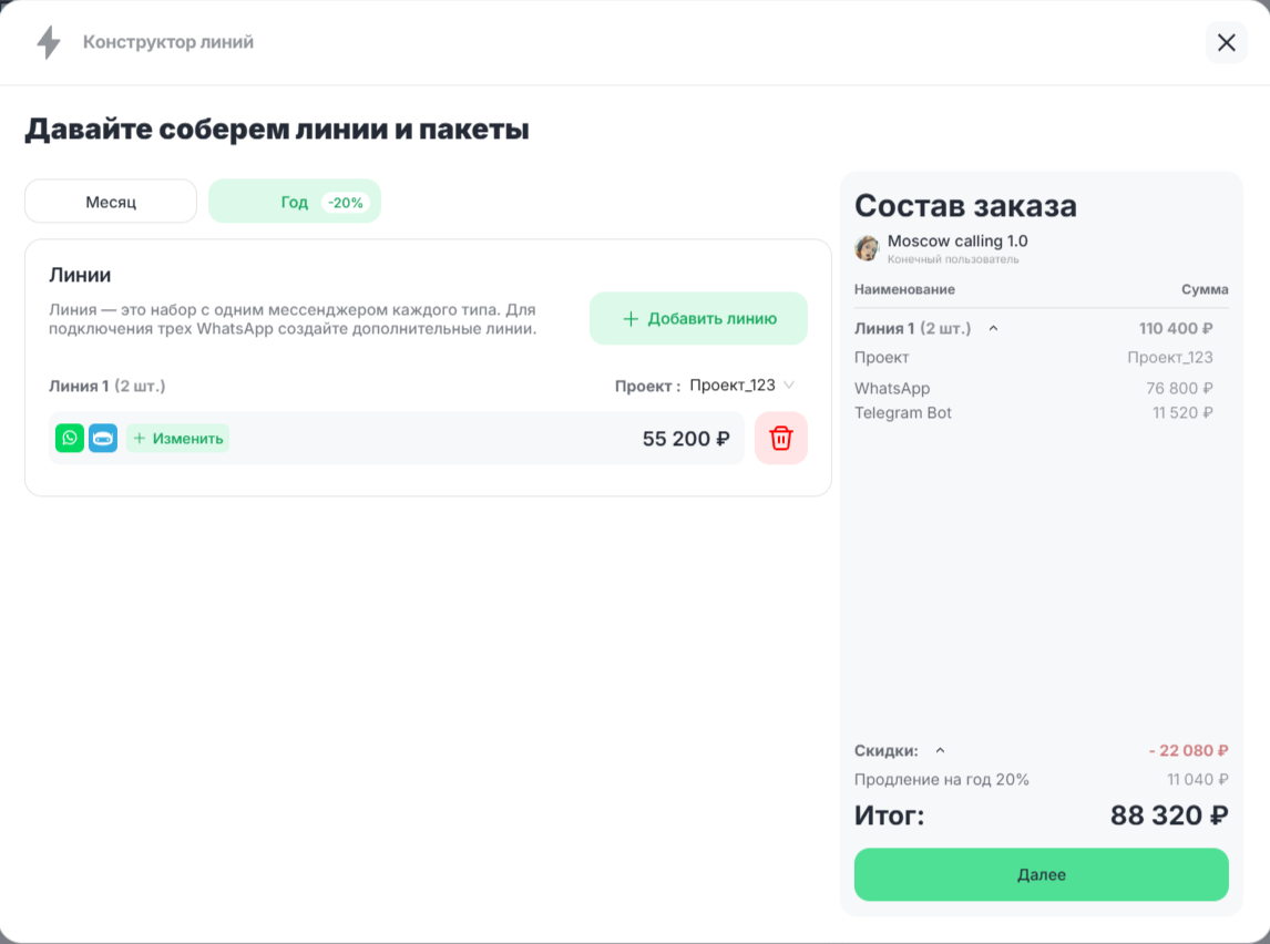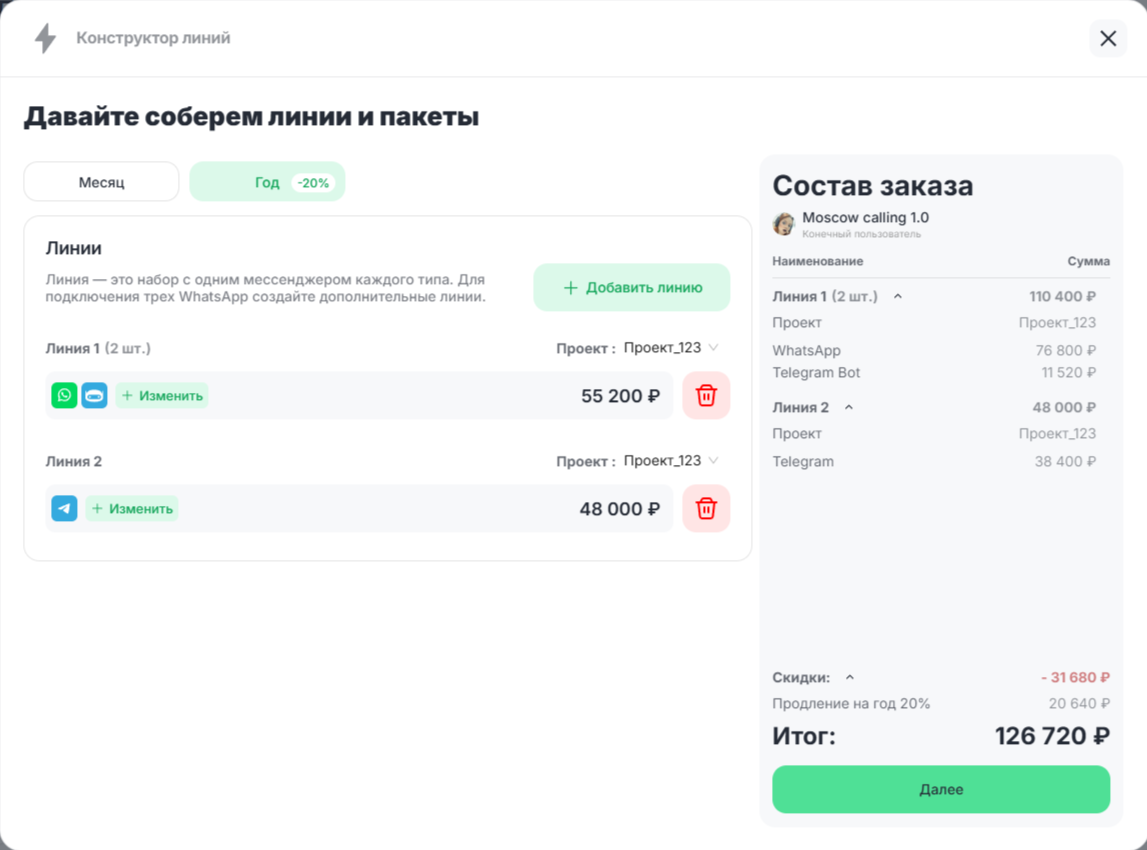 Скидка при покупке линии и итоговая сумма рассчитывается и отображается сразу.