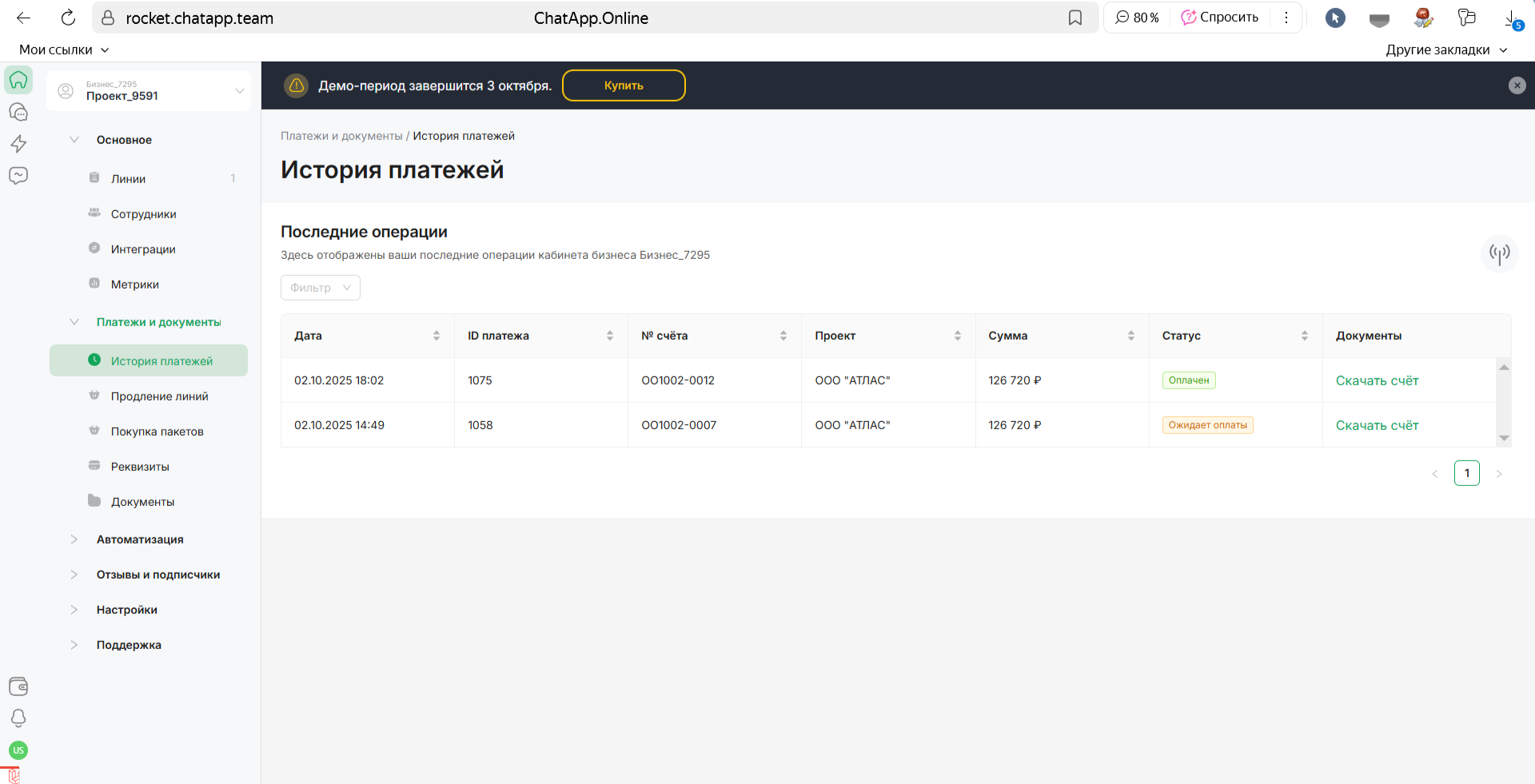 После успешной оплаты, статус счета в Личном кабинете в разделе Платежи и документы --> История платежей устанавливается "Оплачен", линия доступна для работы.