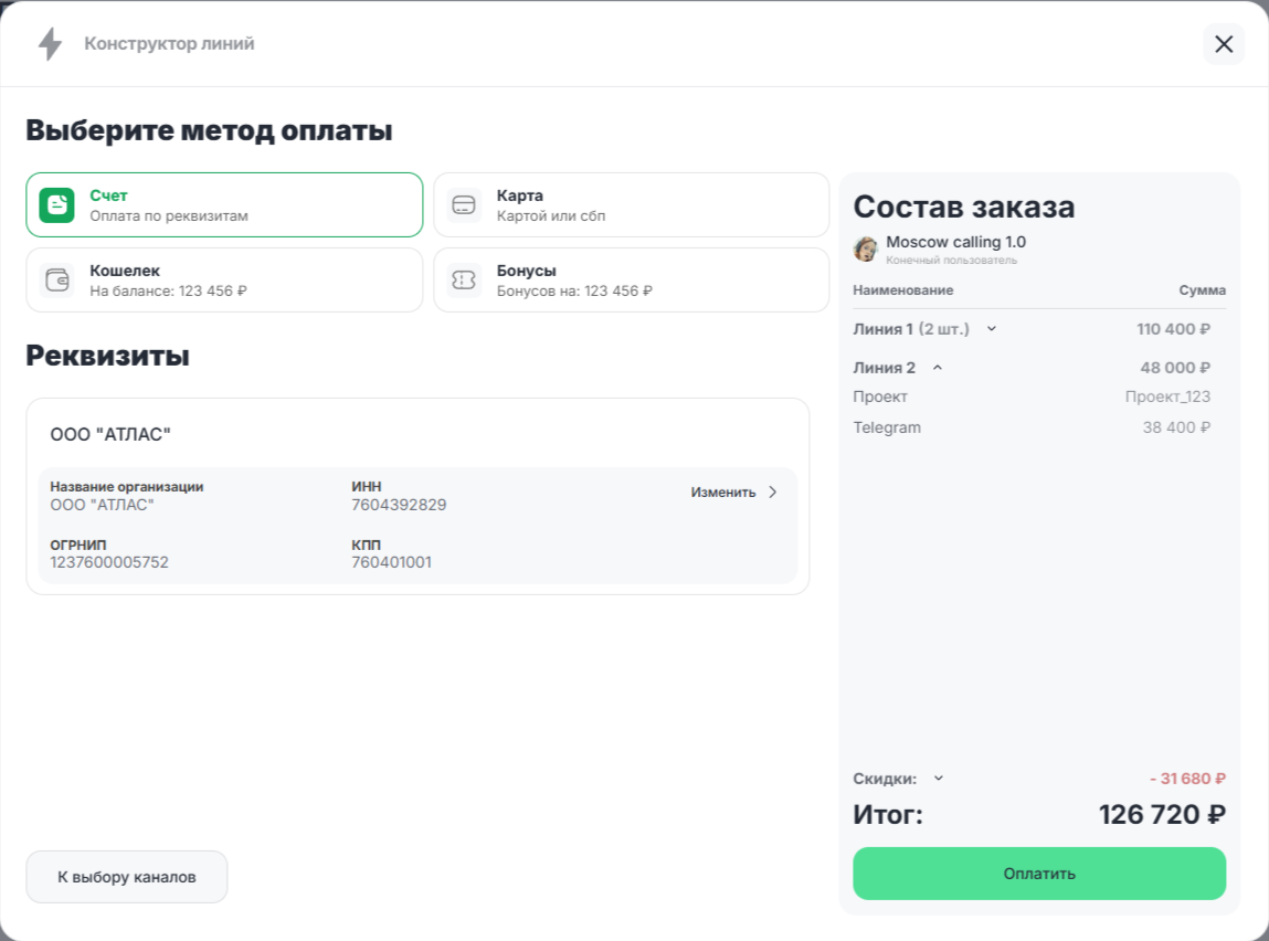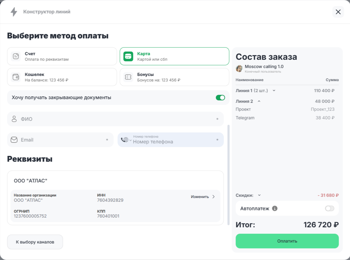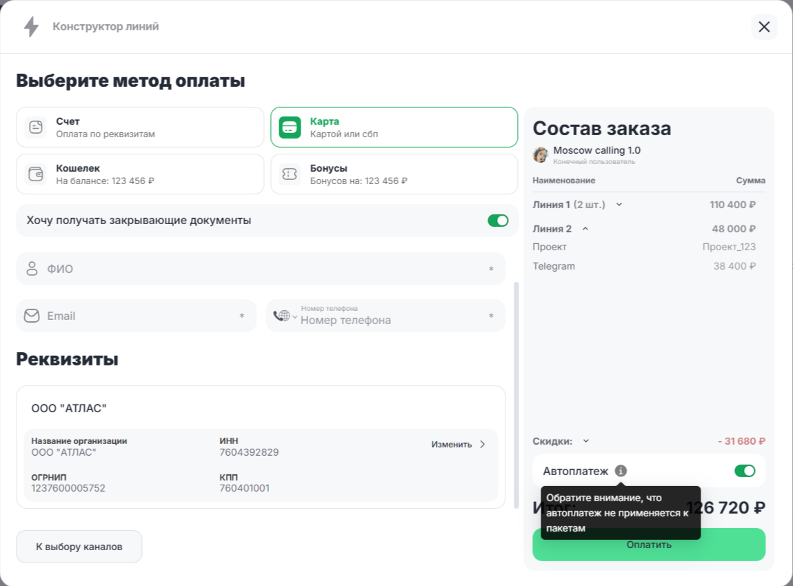 Для оплаты заказа система предложит вам выбрать метод оплаты. Реквизиты плательщика заполняются данными из Организации.
