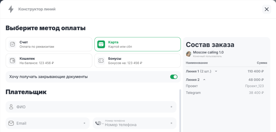 В поля ФИО, Email и Номер телефона введите данные плательщика. Включите тумблер "Хочу получать закрывающие документы".
