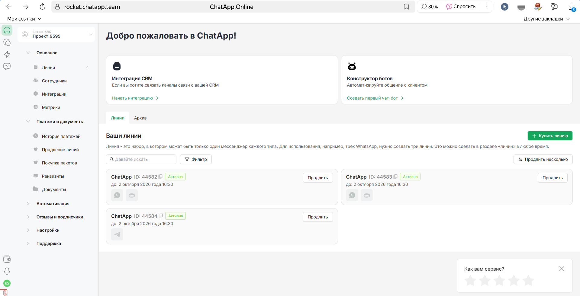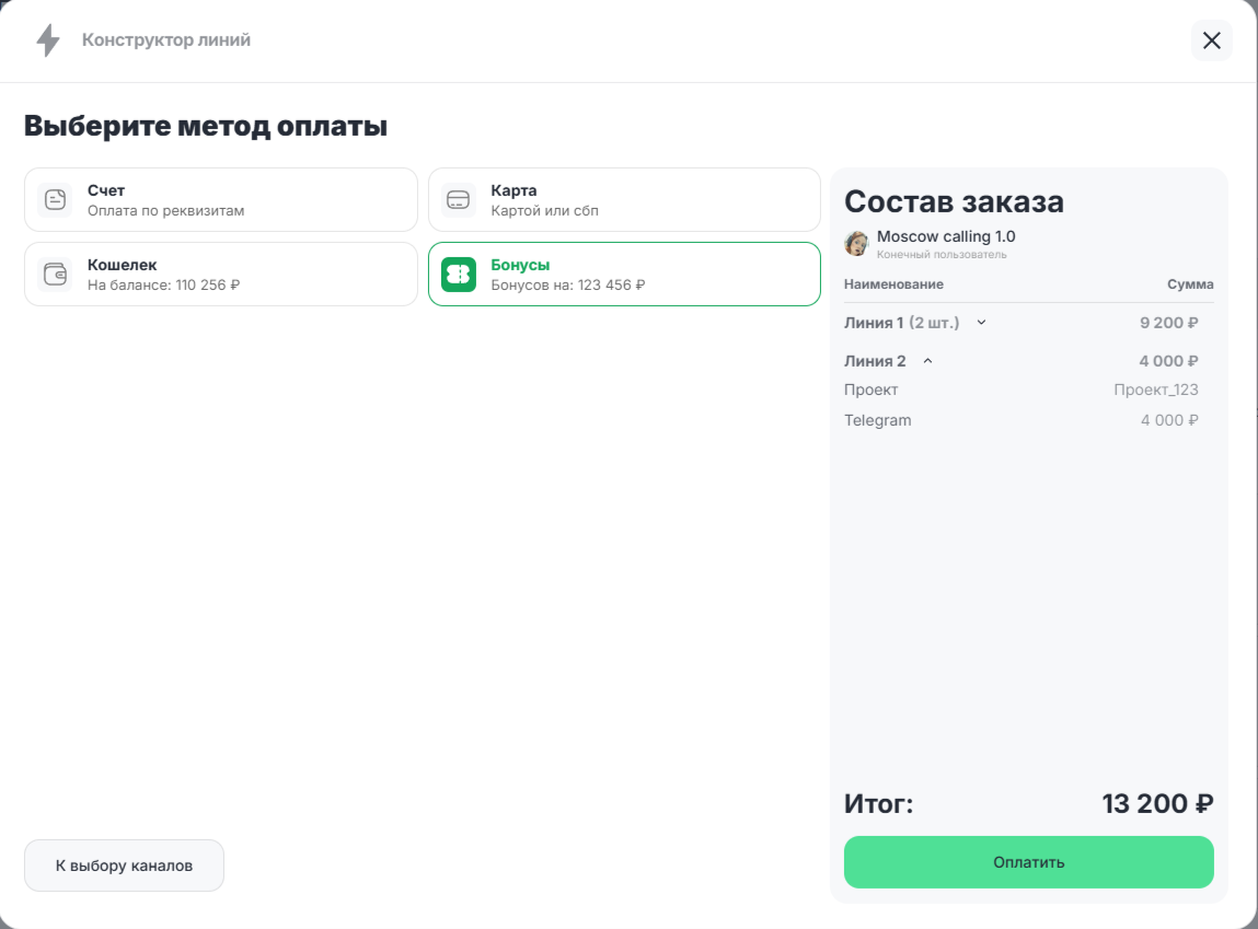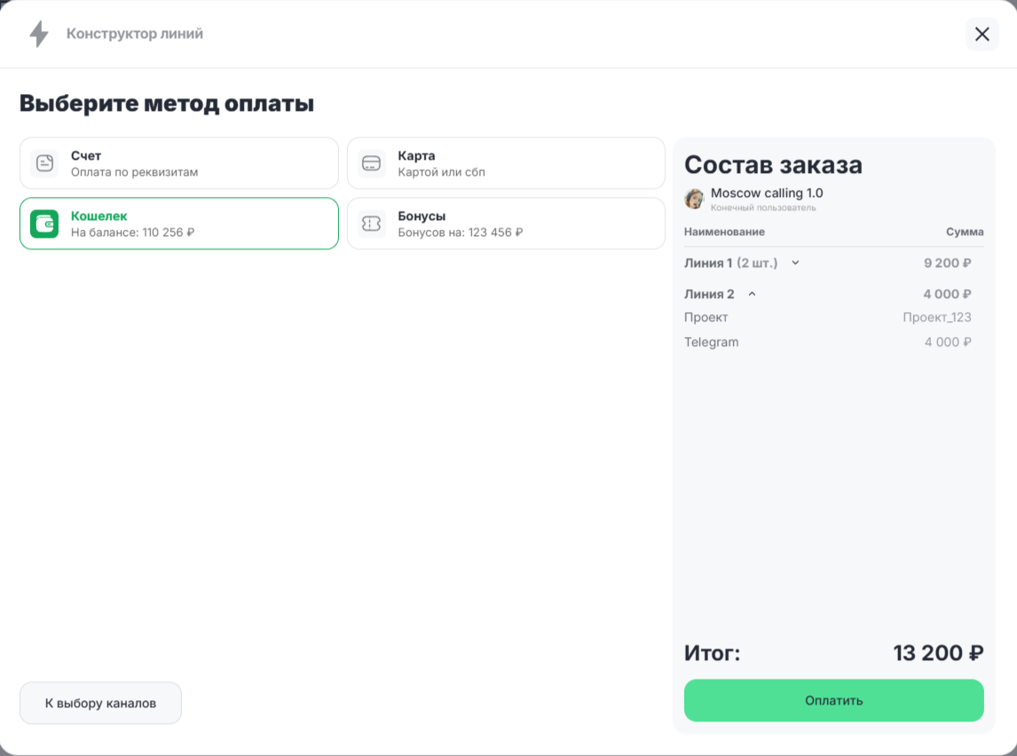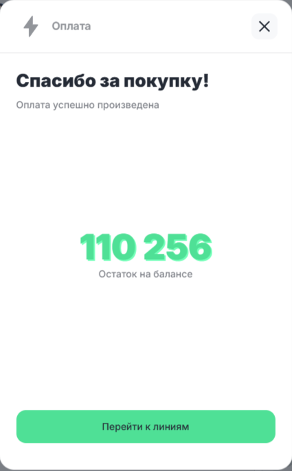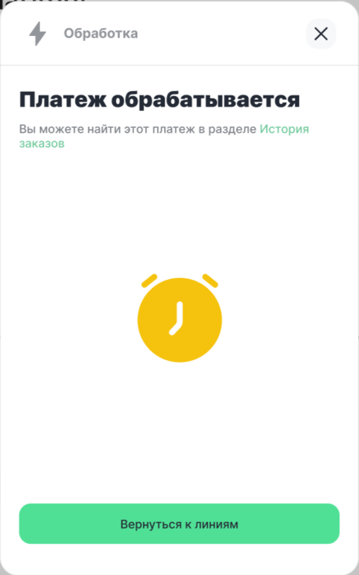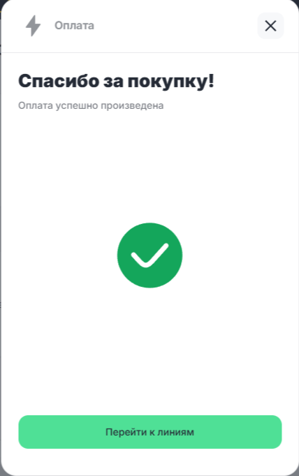 Нажмите на кнопку «Вернуться к линиям» для просмотра созданных линий и входящих в них каналов. Если обработка платежа завершится ошибкой, вернитесь к оплате заказа, проверьте вводимые реквизиты карты и повторите платеж.