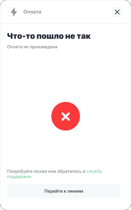 – Ошибка при оплате отображает сообщение о том, что оплата не произведена.
