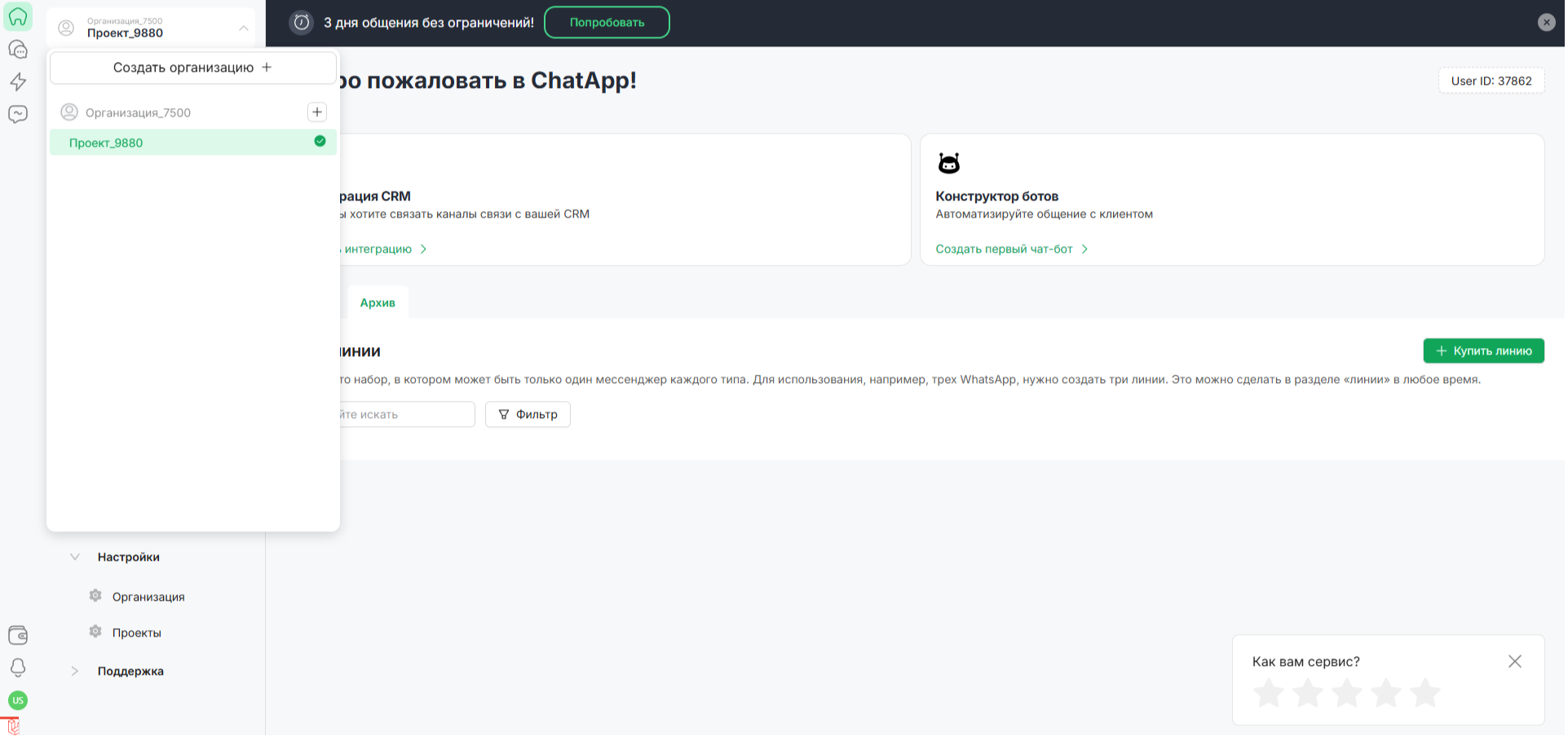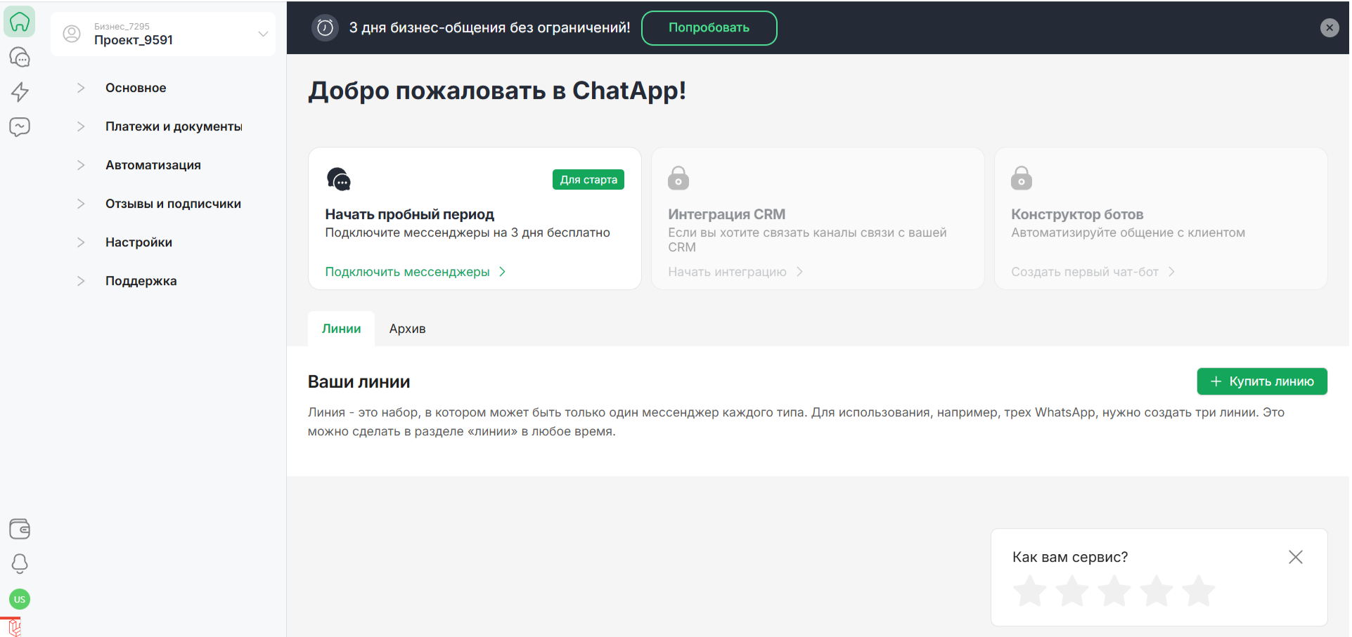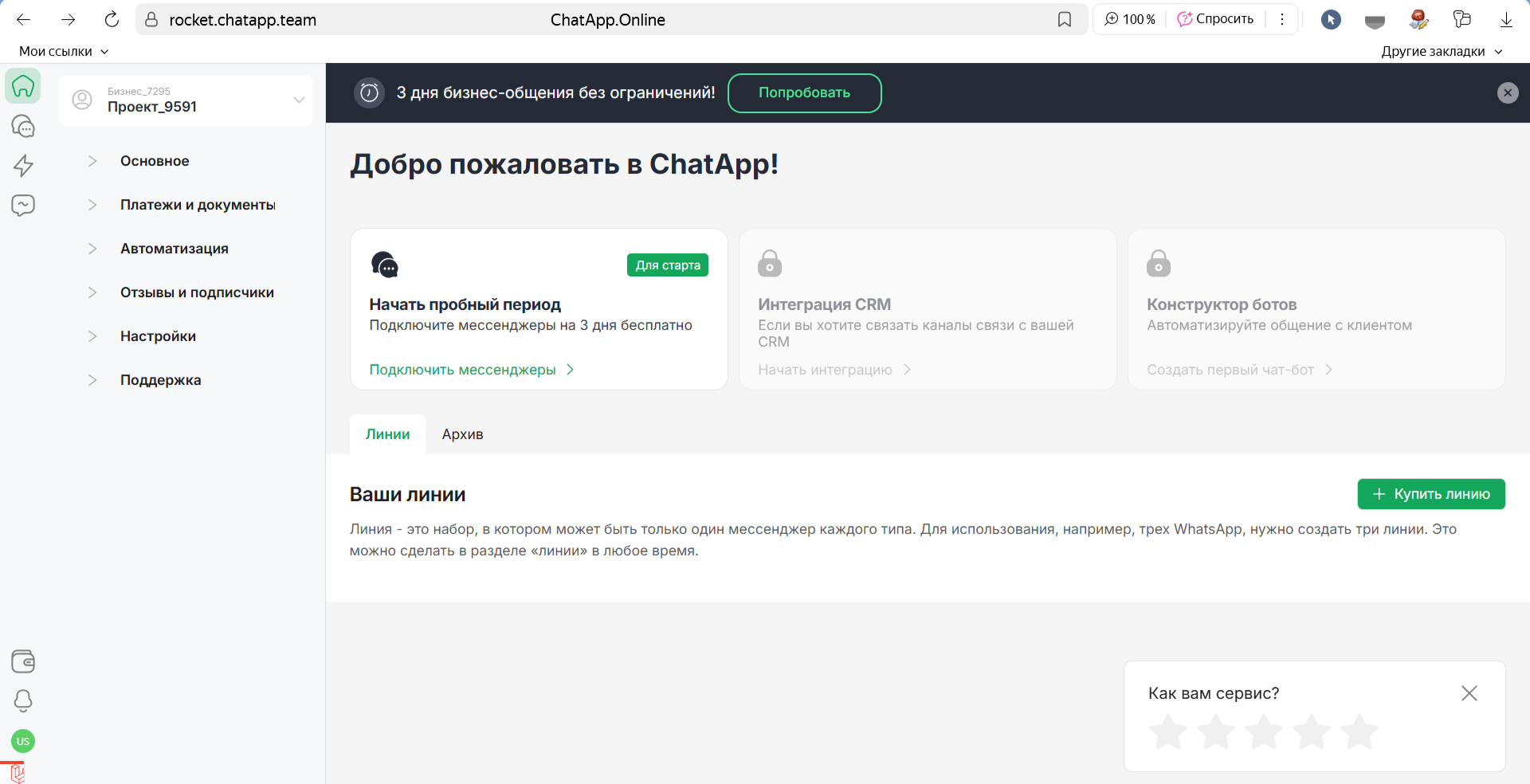 Во время действия бесплатного пробного периода можно подключить и настроить не более 3-х линий.