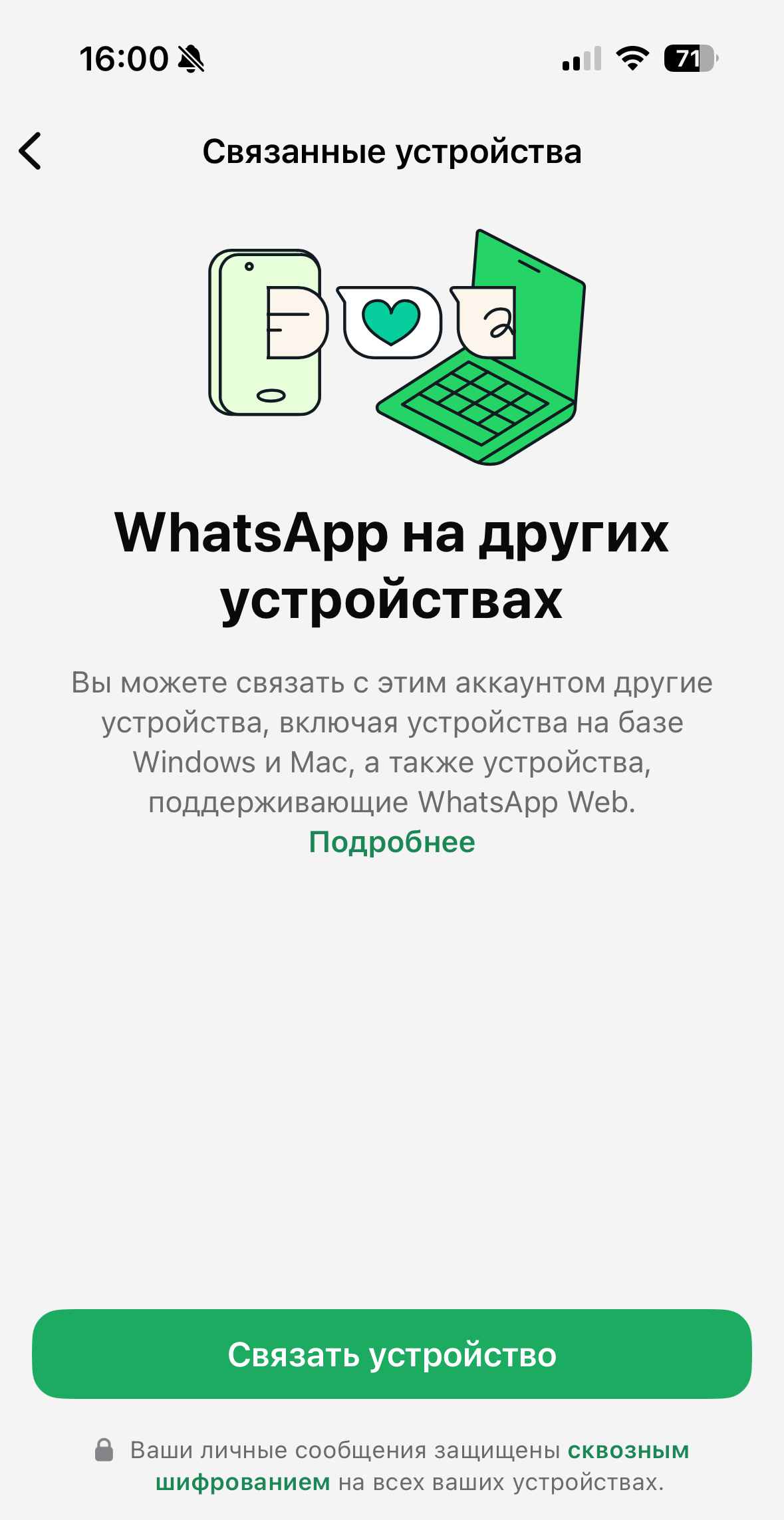 • iOS – перейдите в Настройки. В нижней части экрана выберите пункт «Связанные устройства» — «Связать устройство».