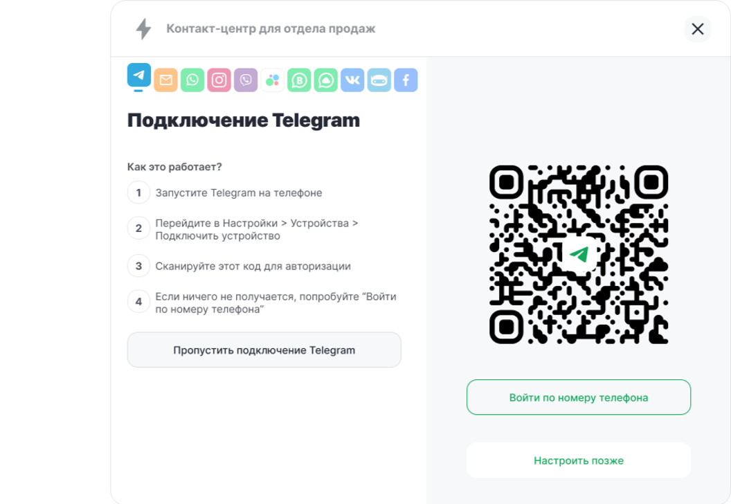 После подключения каналов система предложит настроить линию нажатием на кнопку «Перейти к чатам». Как это сделать - смотрите в статье "Настройка линии".