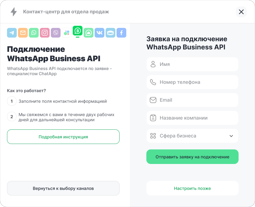 После отправки заявки на подключение с вами свяжется менеджер консультации перед подключением. Процедура подключения WhatsApp Business API без ограничений занимает до 40 минут. Если на аккаунте Facebook имеются ограничения, снятие ограничений со стороны Facebook может занять от 48 часов.