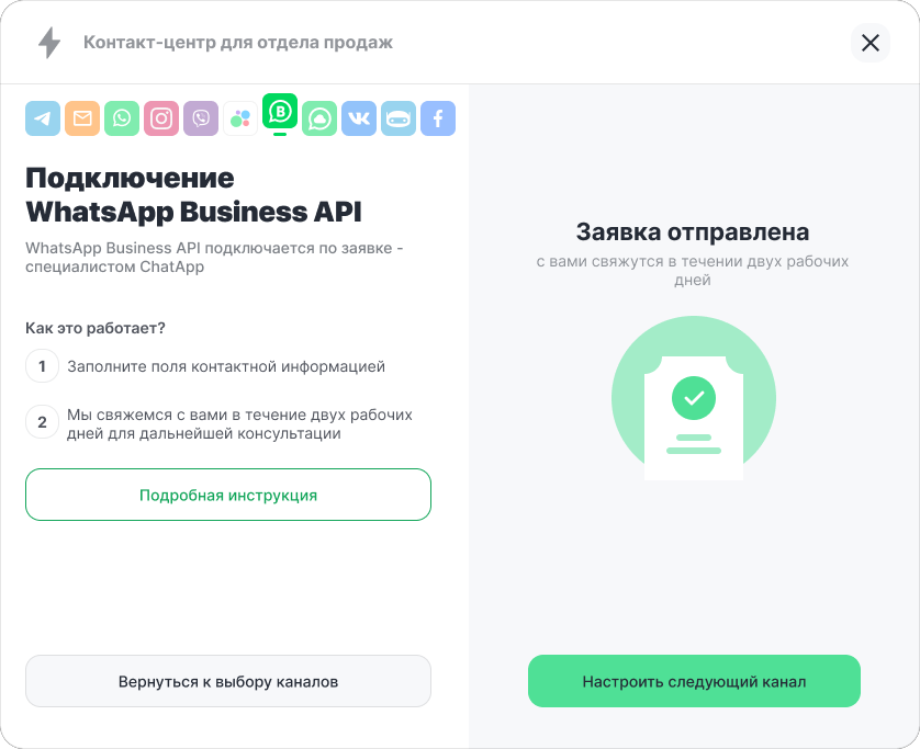 система предложит настроить с подробной инструкцией.Для подключения WhatsApp Business API должны быть:
