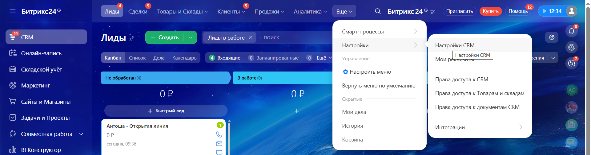1. На главной странице нажмите «Еще» — «Настройки» — «Настройки CRM».