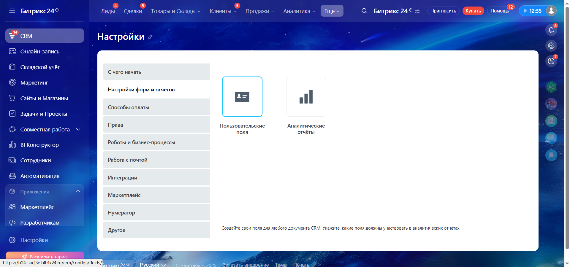 2. Выберите вкладку «Настройка форм и отчетов» — «Пользовательские поля».