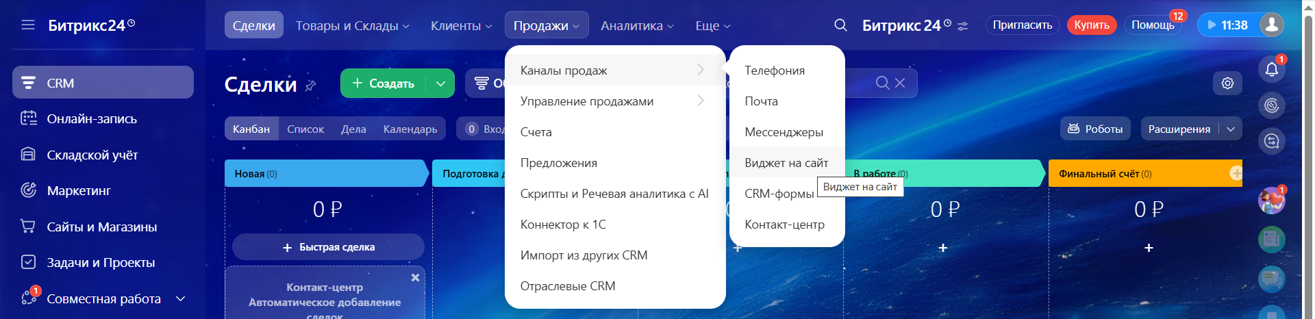 1. В Битрикс24 в меню слева выберите раздел “CRM”.