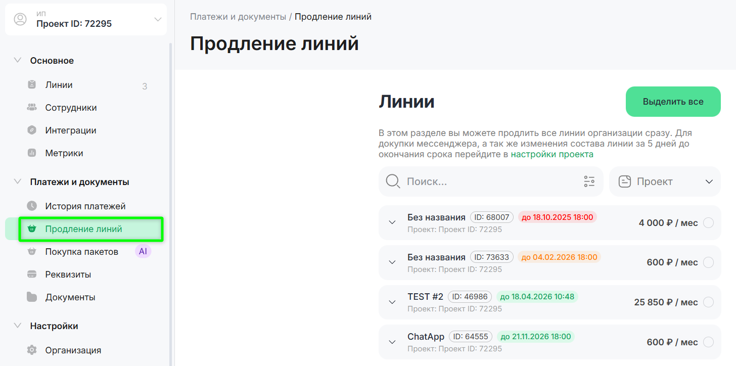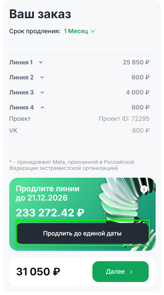 В разделе «Продление линий» доступно продление всех линий организации одним платежом.