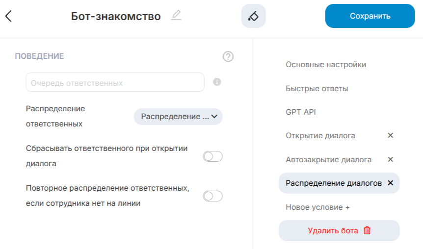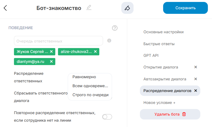«Повторное распределение ответственных, если сотрудника нет на линии» - если опция «выключена», бот будет назначать ответственными за диалог не работающих в данный момент сотрудников. Если опция «включена», распределение начнется заново по заданному поведению.
