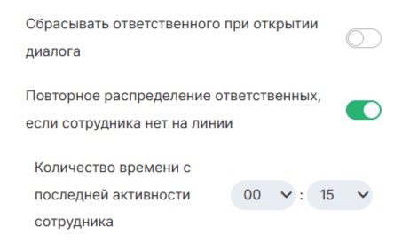 «Сбрасывать ответственного при открытие диалога» - если опция «выключена», ответственным останется тот же сотрудник. Если опция «включена», распределение начнется заново по заданному поведению.