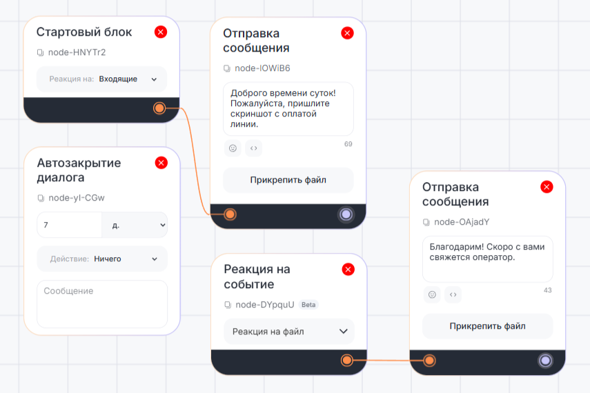 Например, если клиент пришлет файл — сработает блок «Реакция на событие» и бот запустит следующий блок «Отправить сообщение».