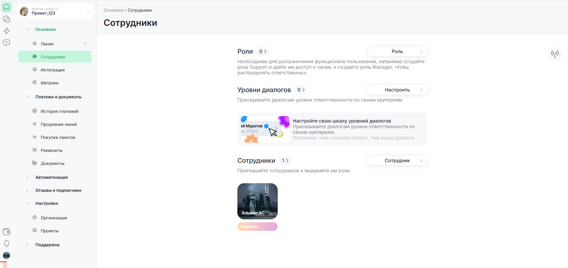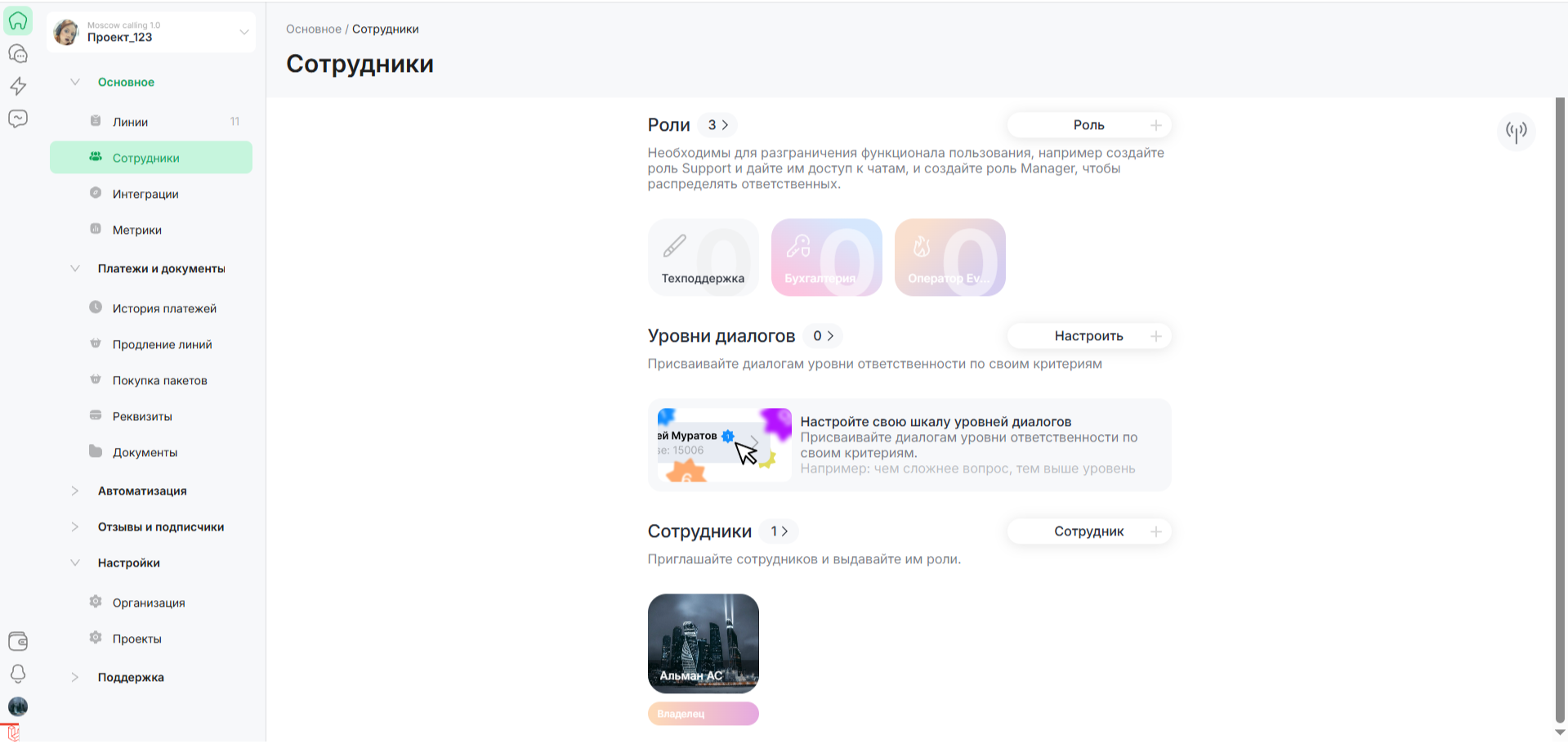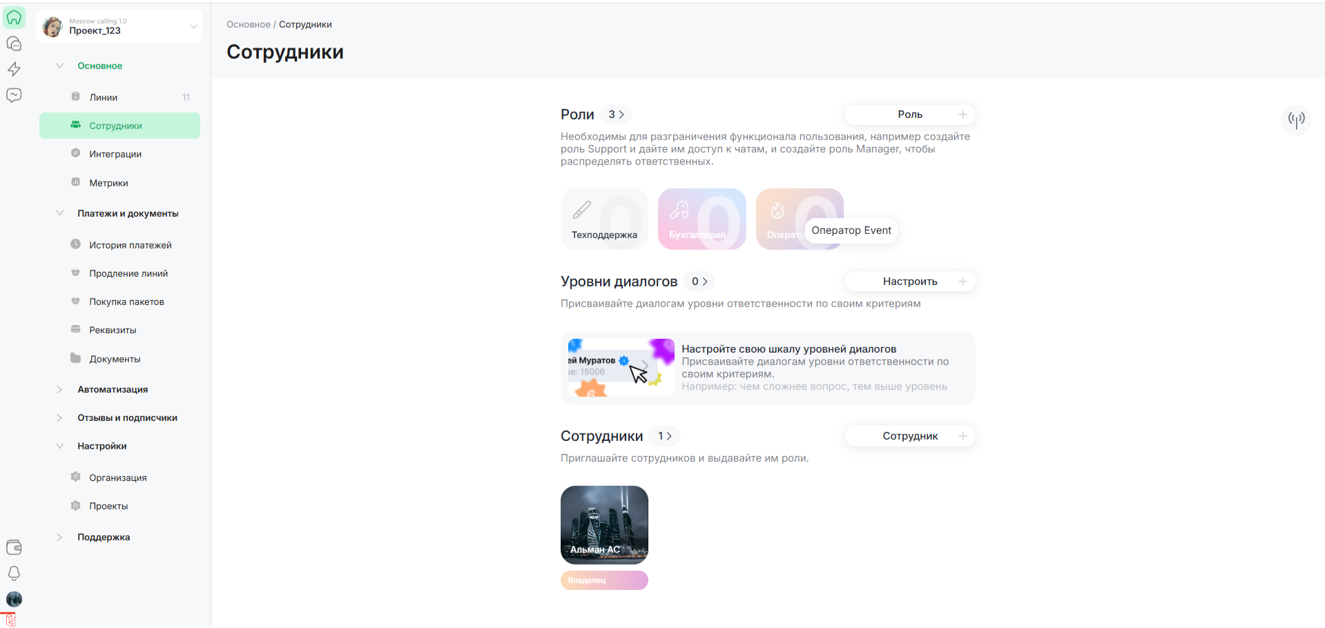 Профилю пользователя при регистрации в системе установлена роль Главного администратора с правом создавать роли в Проектах, исходя из потребностей Организации. Роли создаются для разграничения полномочий. Они определяют права и уровни доступа к функционалу и организационной структуре. Например, роль «Оператор» предоставляет доступ к чатам, «Менеджер» -- распределяет ответственных. Роли создаются для каждого Проекта Организации и назначаются его сотрудникам.