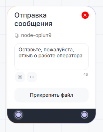 Блок «Сбор отзыва» собирает отзывы пользователей в чате и сохраняет в поле «Отзыв» раздела «Метрики». Блок может понадобиться, например, чтобы оценивать работу специалистов технической поддержки.