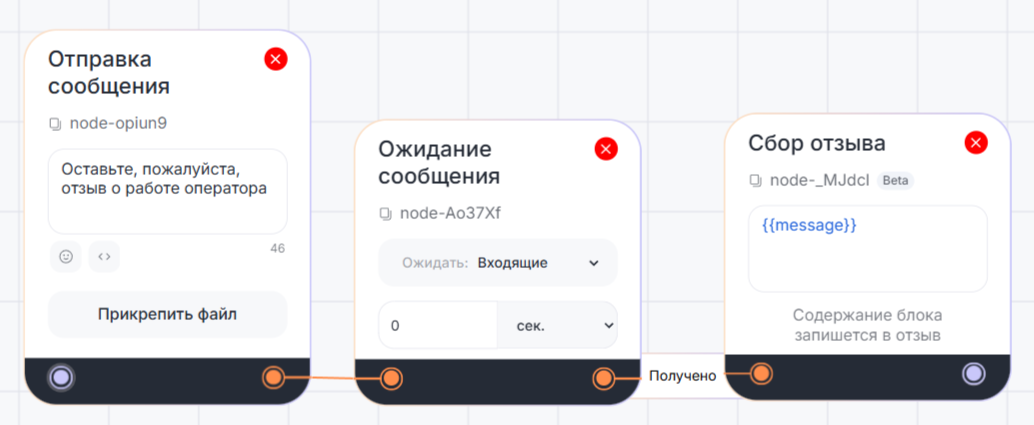 2. Добавьте блоки «Сбор отзыва» и «Ожидание сообщения», чтобы бот дождался сообщения от клиента.