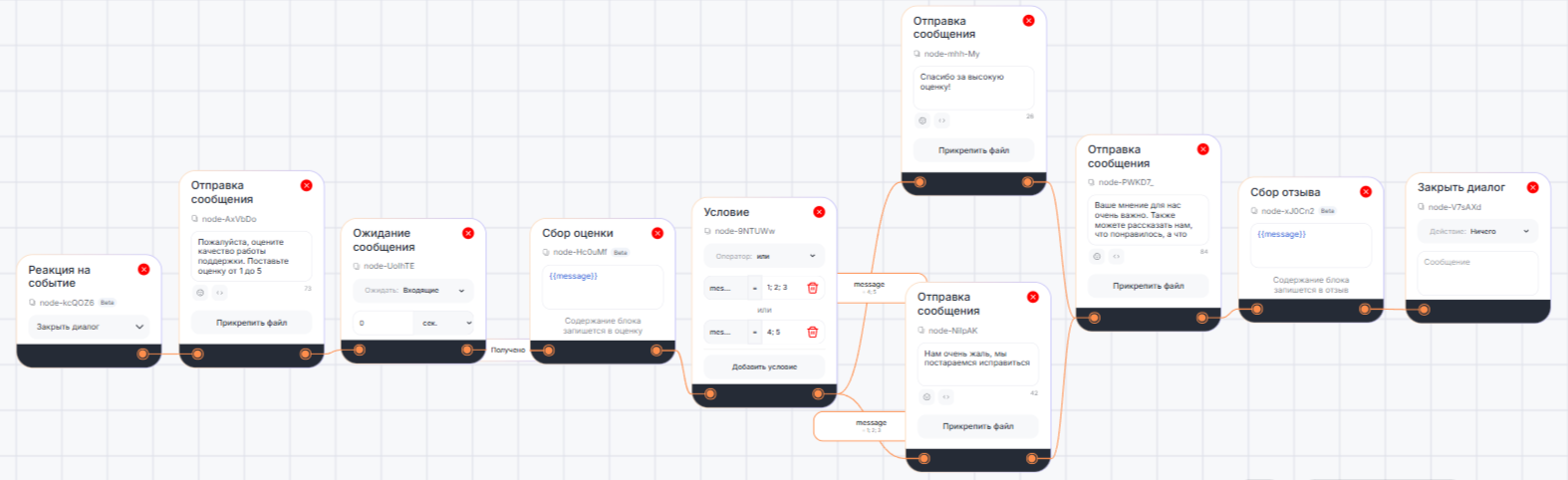 Блок можно использовать, например, в сценарии для технической поддержки. После закрытия диалога бот отправит клиенту сообщение с запросом оценки и сохранит ответ в поле «Отзыв» раздела «Метрики» с помощью блока «Сбор оценки». В зависимости от выставленной оценки будет отправлено подходящее сообщение. Затем бот попросит написать развернутый отзыв на работу поддержки и сохранит его в поле «Отзыв» раздела «Метрики» с помощью блока «Сбор отзыва».