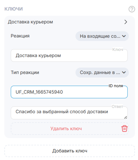 Введите ключ на который будет действовать бот. Например, вы хотите записать в CRM выбранный клиентом вид доставки, тогда вы ставите ключ - Доставка курьером.